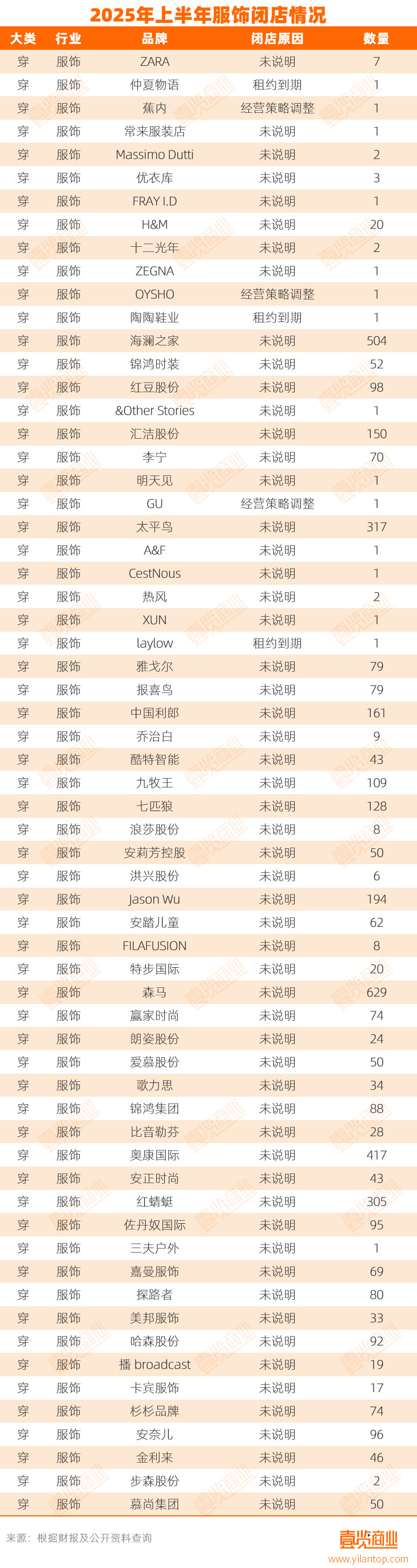 据壹览商业不完全统计,2025年上半年,全国至少有4563家服饰门店关闭。其中,森马关闭629家关店总量最多,GU极优关闭包括中国首店、华南首店在内的多家门店。