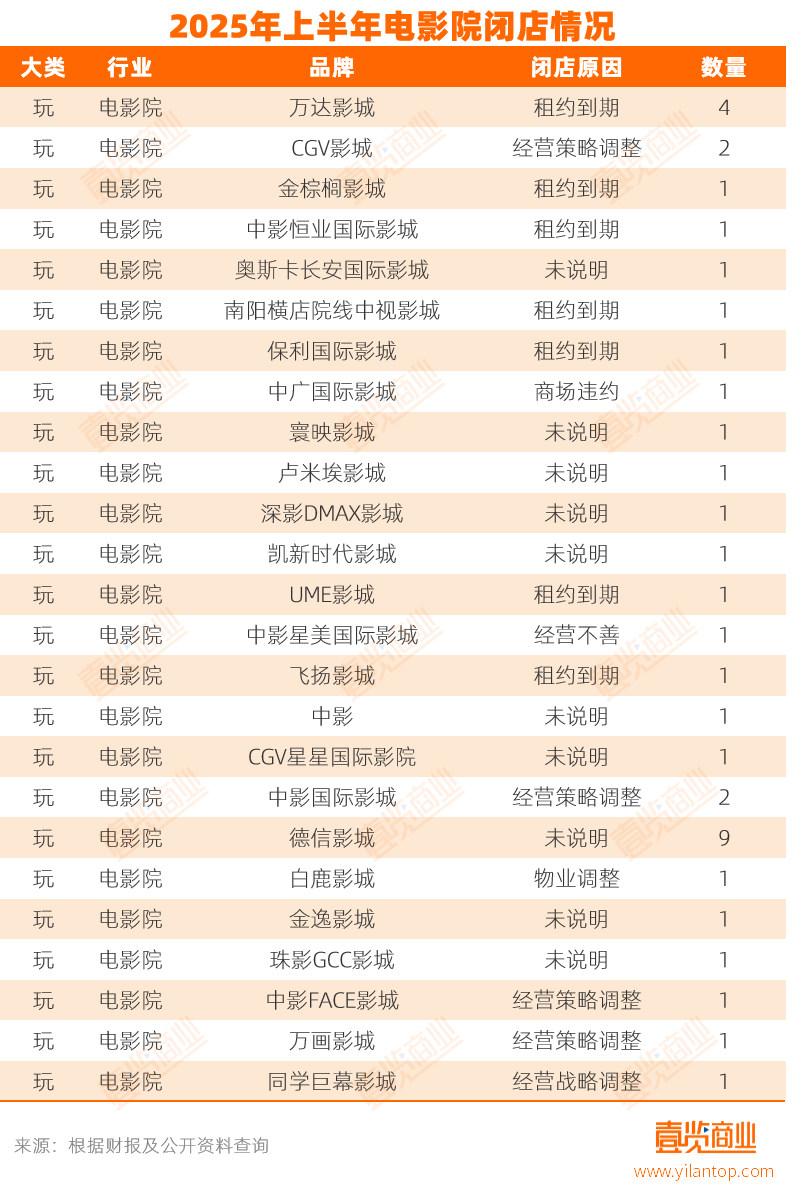 据壹览商业不完全统计,2025年上半年,全国至少有38家电影院关闭。3月1日,UME影城(北京华星店)宣布闭店,这家影业已经经营22年,是北京第一家引入IMAX的影院;CGV长沙麓山店、上海卢米埃大融城影城、佛山兆阳保利国际影城等,也都选择了关门。