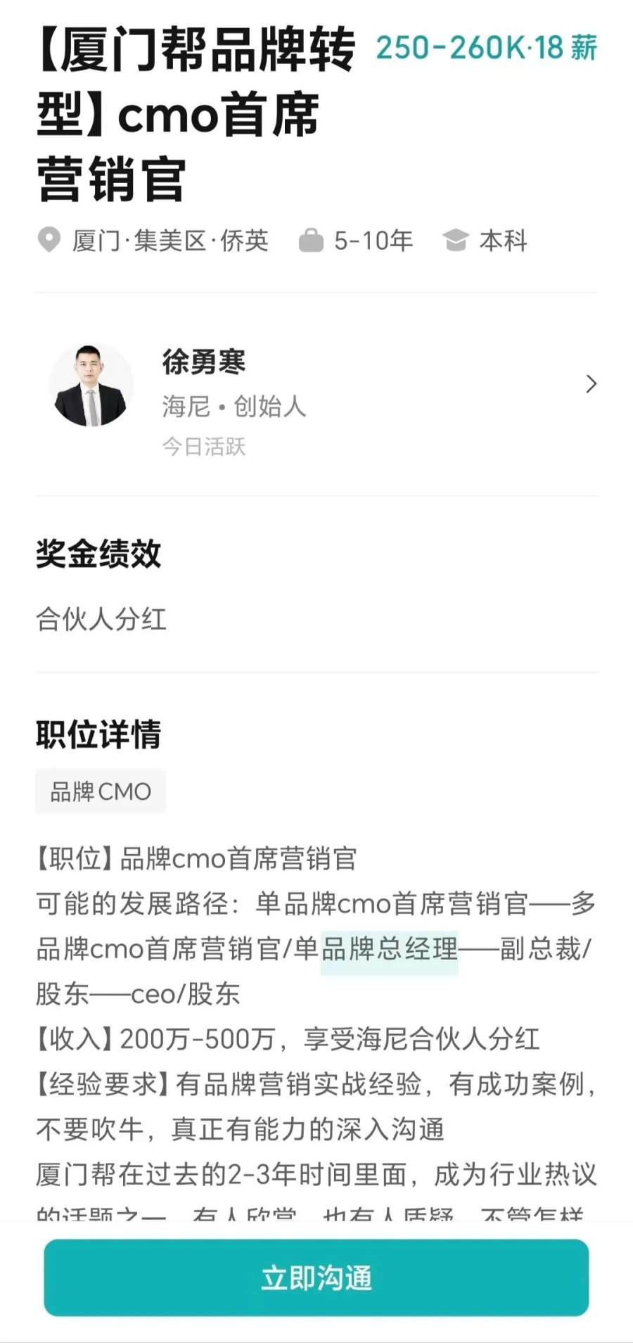 人才上的变化十分直观。过往,厦门帮的核心人力全集中在投手和内容运营岗位,鲜有品牌岗位设置。今年起,头部公司开始密集招聘品牌营销端、研发端人才。如今在BOSS直聘内,海尼集团公开招聘配方工程师、品牌总监、品牌策略师等,创始人徐勇寒更是直接开出500万年薪和分红,招聘CMO助力品牌转型。