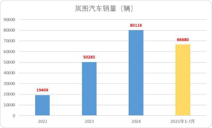 在财务层面,从2022年至2024年,岚图销量从1.94万辆增长至8.01万辆,复合年增长率高达103.2%,2025年前7个月销量已达6.8万辆以上,同比增长88%。