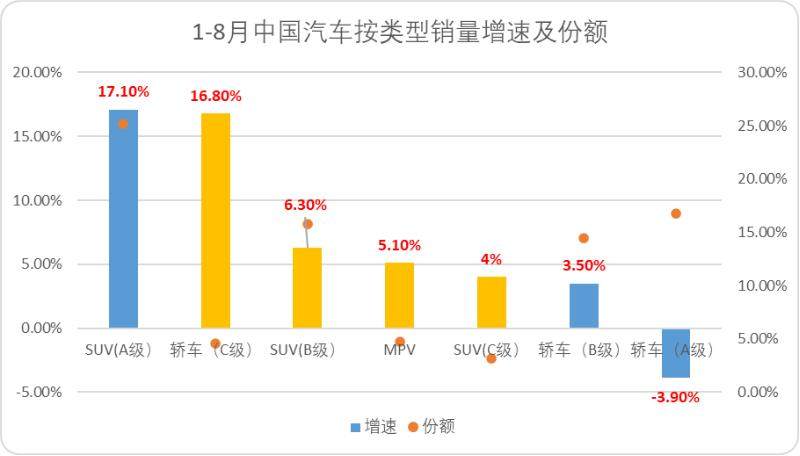 图:1-8月中国汽车按类型销量增速及份额,来源:乘联会