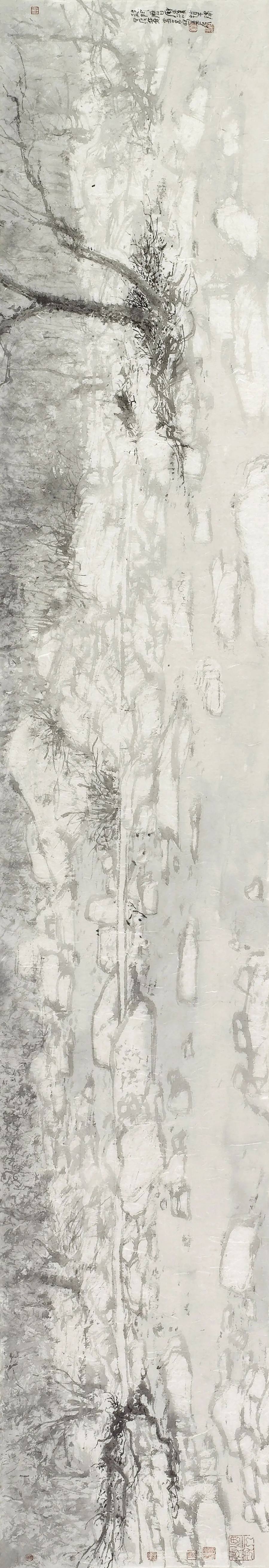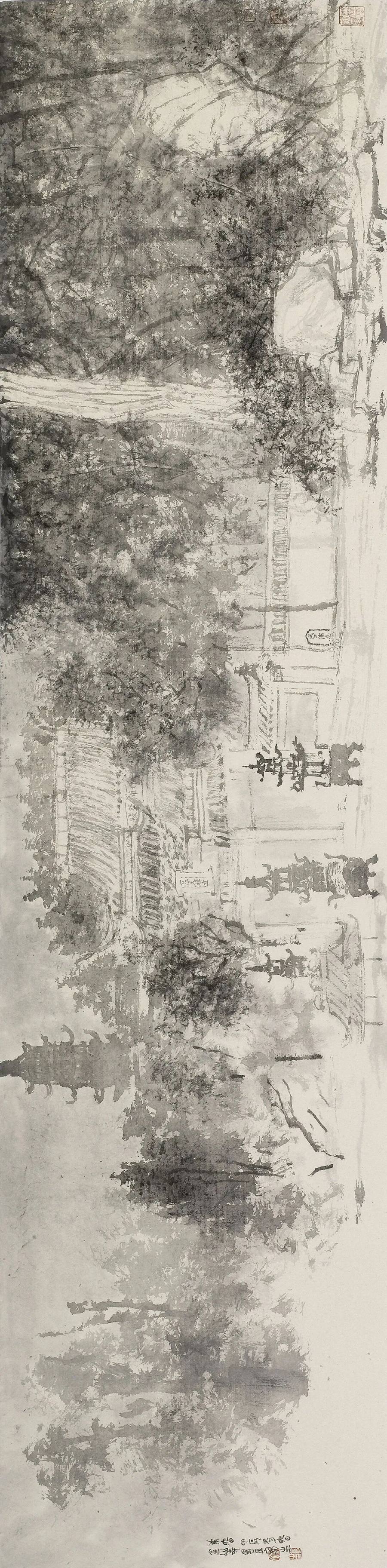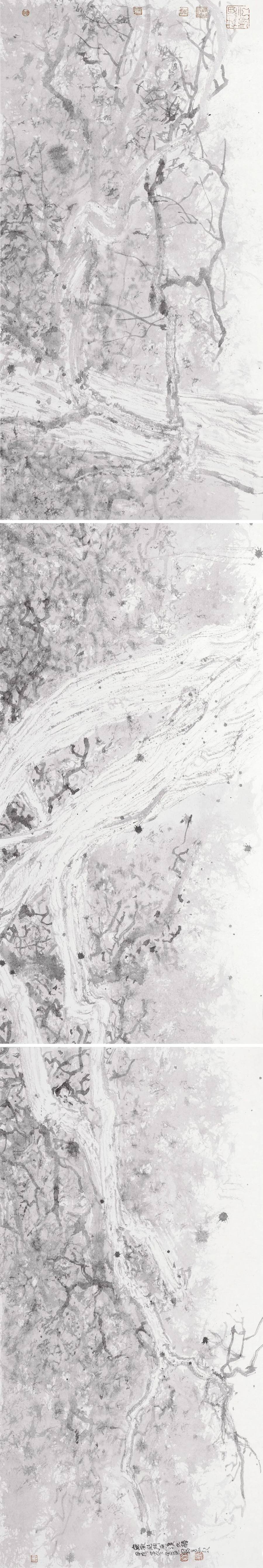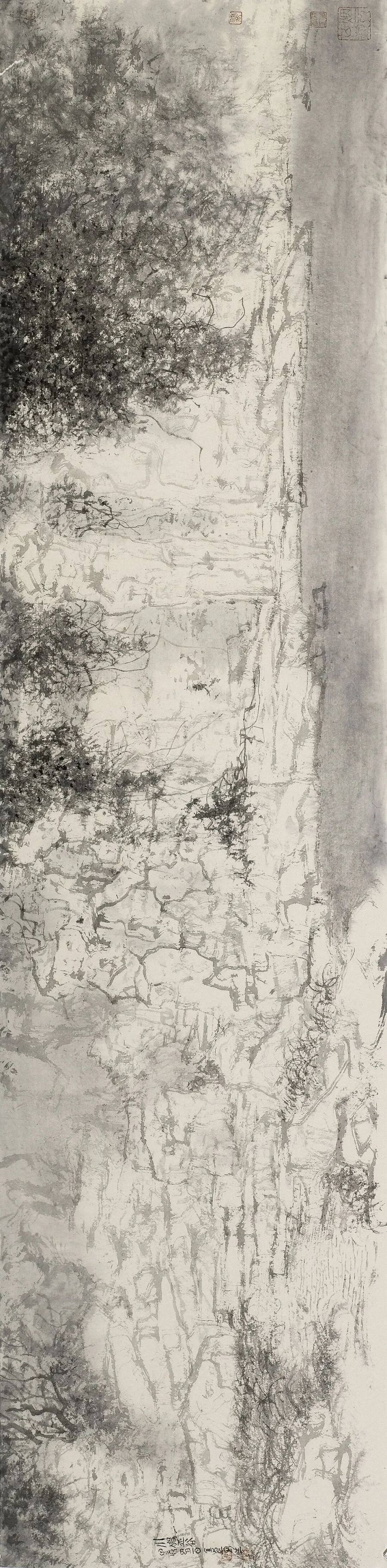 董金良的山水画没有沿袭传统图式,却能承接传统精神,以山川外在之“景”写出画家内心之“灵”;亦不是用素描或者西画的诸多方式消解山水画笔墨意趣的核心价值,却能借鉴现代艺术的形式构成化解传统山水程式化的桎梏和羁绊,从二者之间董金良找到了属于自己的一方天地、一条大道。作为相知好友,我在他的画中看到了属于这个时代的山水图景,看到山水画所应走的方向,或许不是唯一,但令我憧憬他的未来。