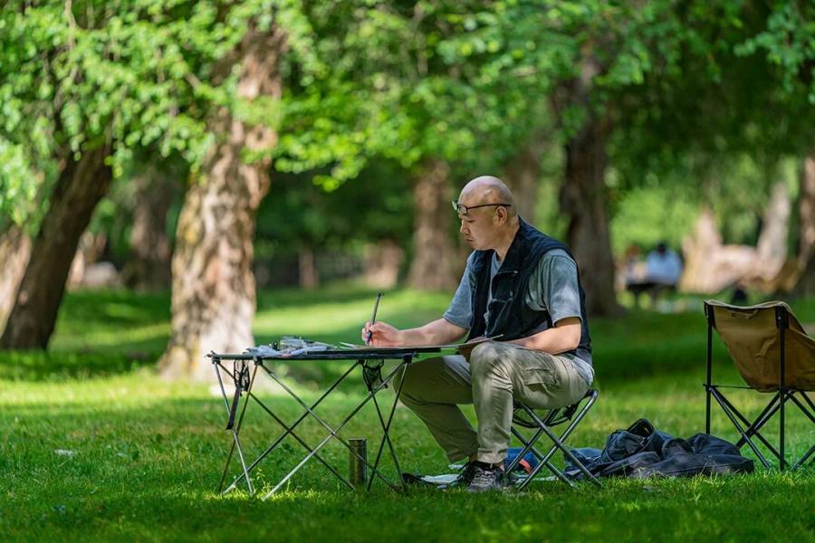 董金良的水墨写生,以苍润笔墨织就林间意趣。枯笔与泼墨相生,枝桠如游龙盘绕,墨点似晨露散落,既得自然肌理之真,又融书写性的洒脱。他把现场的光影、草木的呼吸,都凝进黑白灰的节奏里,让每一幅写生都成了水墨与自然对话的私语笺。