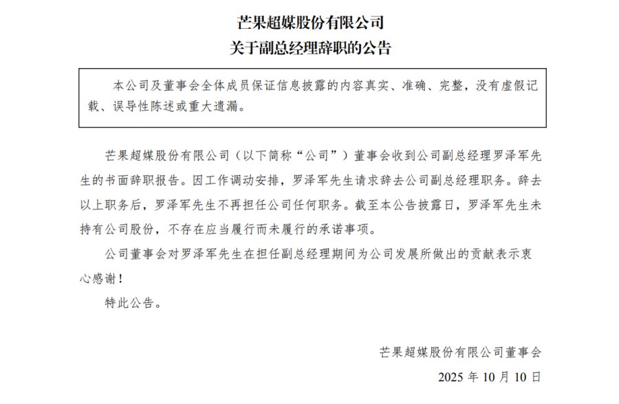 10月10日,芒果超媒公告,公司董事会收到副总经理罗泽军的书面辞职报告。因工作调动安排,罗泽军请求辞去副总经理职务。辞任后,罗泽军不再担任公司任何职务,目前未持有公司股份。公司董事会对其在任期间的贡献表示感谢。