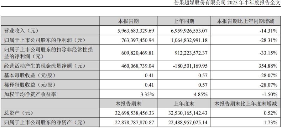 2025年中报显示,今年上半年芒果超媒的营收、归母净利润依旧没能扭转2024年“双下滑”颓势。上半年,公司营业总收入为59.64亿元,较去年同期减少9.96亿元,同比下降14.31%。归母净利润为7.63亿元,较去年同期减少3.01亿元,同比下降28.31%。