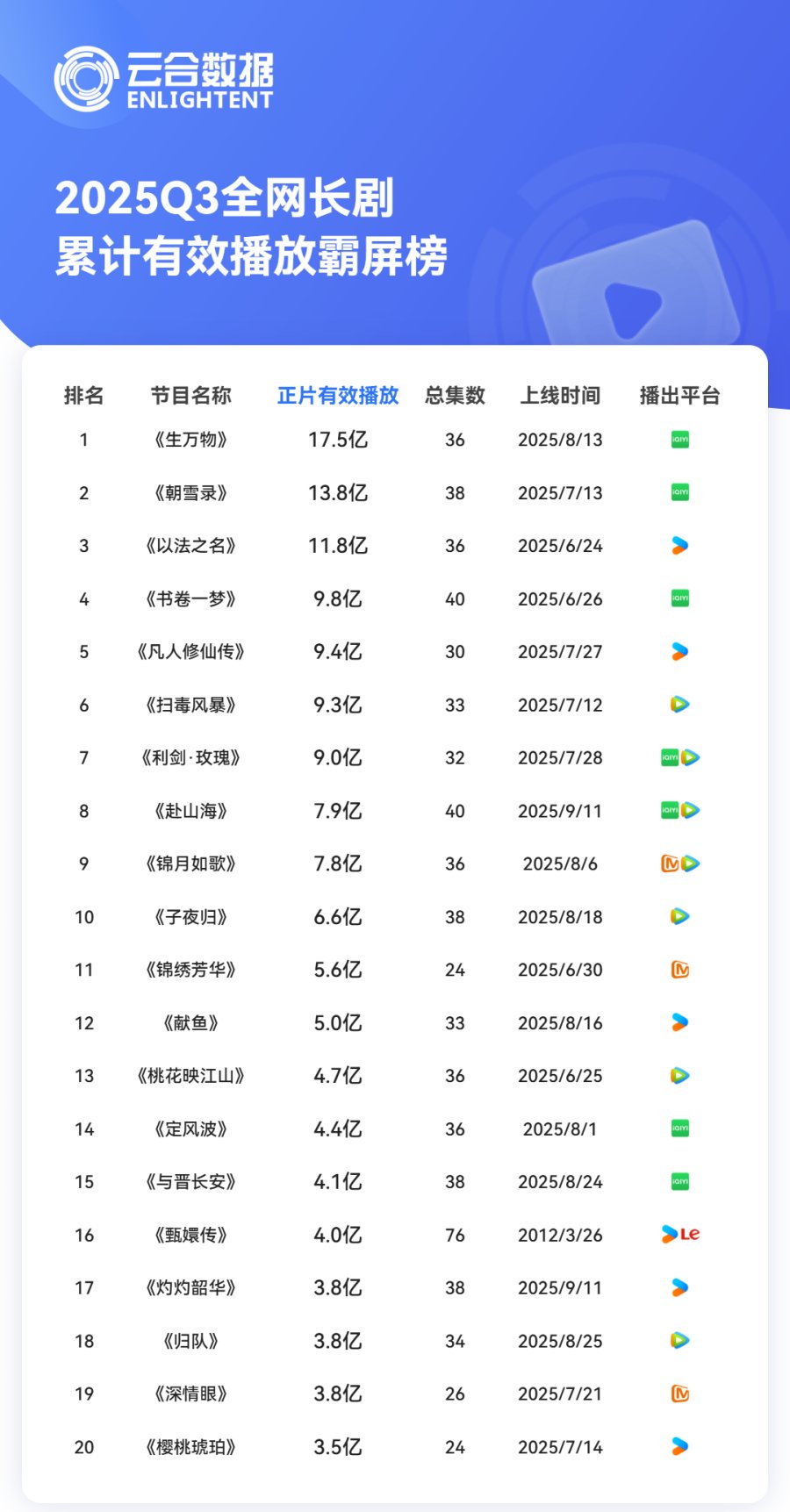 然而,虽然综艺成绩亮眼,但芒果TV在剧集上存在长期短板。在云合数据发布的2025 Q3全网长剧累计有效播放霸屏榜上,芒果TV仅有两部独播剧——《锦绣芳华》和《深情眼》上榜,分别位列第11名和第19名。
