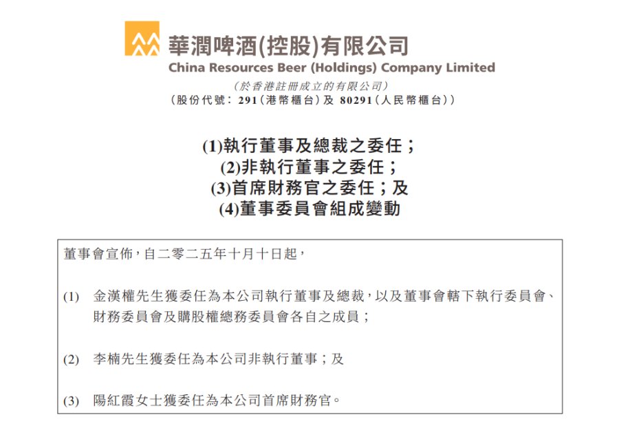 10月10日,华润啤酒在港交所公告,董事会宣布,自2025年10月10日起,金汉权获委任为公司执行董事及总裁,以及董事会辖下执行委员会、财务委员会及购股权总务委员会各自之成员,与此同时,他还将兼任华润酒业总经理;李楠获委任为公司非执行董事;阳红霞获委任为公司首席财务官。