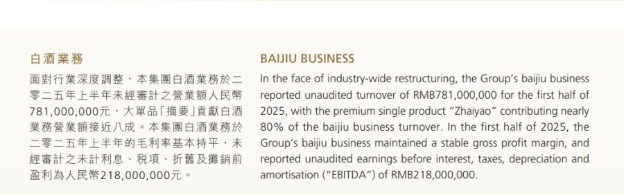 而华润啤酒白酒业务未经审计营业额7.81亿元,去年同期该业务实现营业额11.84亿元。今年上半年未计利息及税项前盈利为-1.52亿元,同比转亏。