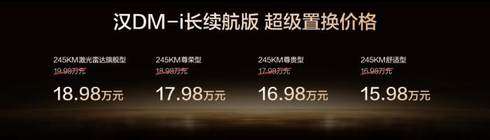 此次,汉DM-i长续航版共推出4款车型,补贴后售价15.98万~18.98万元;汉EV长续航版共推出3款车型,补贴后售价17.38万~20.58万元(10月31日前完成购车可享1万元超级置换补贴)。同时,比亚迪还为用户准备了包含置换补贴在内的至高价值3.8万元七大礼遇。