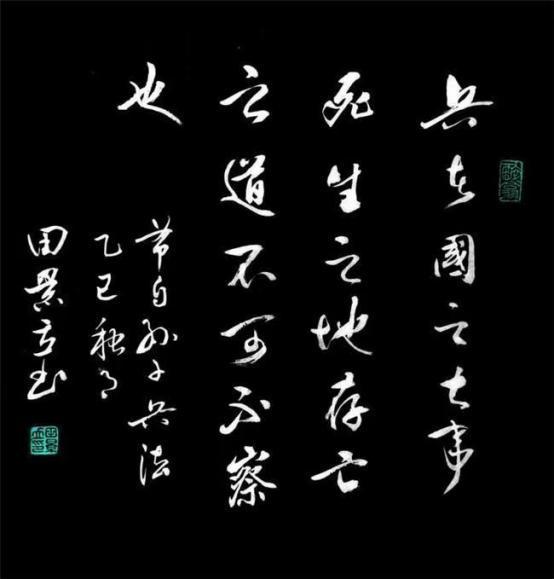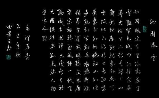 观田景立先生作品,既有其个人风格与面貌,又有书卷气息的深邃的内涵。他在创作中用笔方圆兼施,笔墨之间始终透着一股高雅的情怀,结字潇洒严谨,俊秀而笔力遒劲、生动明快,点画上厚重而且不失洒脱自然,笔画之间的连带流畅自然,结构严谨不失法度。通篇看来气息沉雄、淳朴典雅、气势恢宏大气,骨力遒劲而气概凛然,于随意之中显示其精妙与豁达,呈现出古朴华美的笔墨情趣。在田景立先生的笔下,线条纵情挥洒,极力表达情感与情趣的相依相容,厚重与凝重的相得益彰,古典与现代的相映成趣,让观者感受到神采飞扬的律动、宛转悠扬的节奏、洒脱豪迈的气魄。可以看出,田景立先生的书法在给人以视觉审美的同时,其用笔、结字、墨法等也相辅相成,让人感受到一种精神美,并反映出了诗意的气质和人文情怀等综合学养。因此,欣赏他的书法是一种惬意的享受,字与字之间都透露出一种英雄的豪气,可谓是大气磅礴,灵动飘逸。将内涵哲理和自身的书法感悟完美融合在了一起,使整体意境优美大气,散发着浓郁的文化气息,极具生动的情趣。田景立先生在书法艺术方面的精湛造诣,不仅给人一种高雅的艺术美感和精神享受,更使我们感受到中华民族灿烂文化的魅力。使其体现出深厚的民族文化底蕴、高尚的思想情操、宽阔博大的胸襟;同时凝聚着他对艺术的思考,渗透着他丰富情感和审美体验。