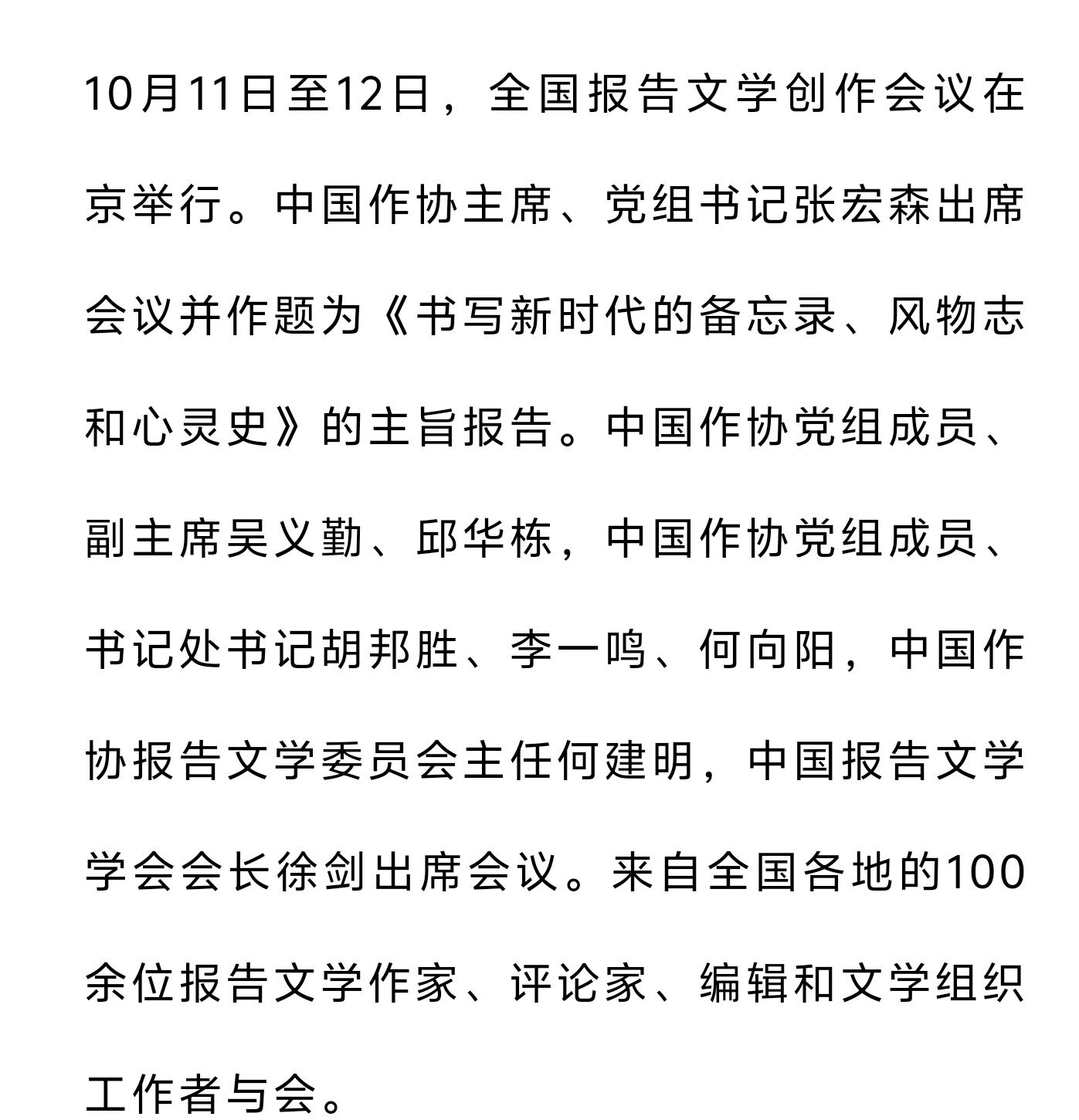 通过阅读会议相关文章,我深受启发和鼓舞。这次会议为报告文学的发展指明了方向,让我对创作有了更深刻的认识和思考。作为学会会员,将持续用自己的青春热血去用心打磨创作。