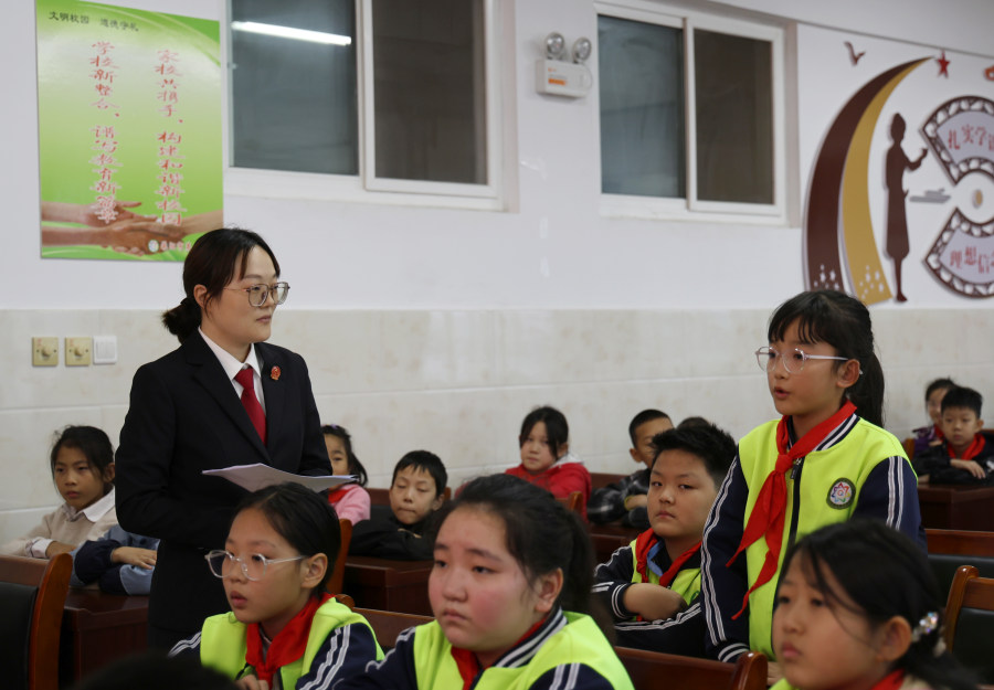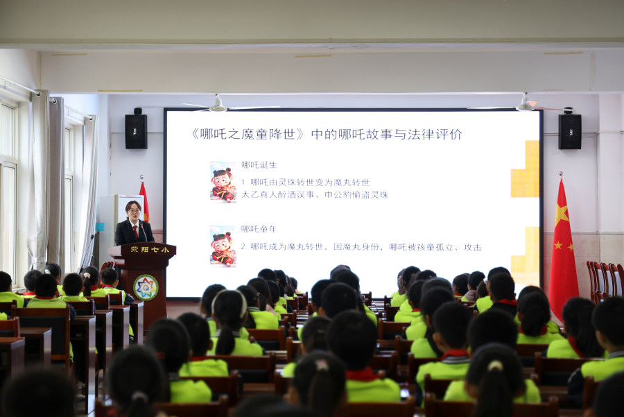 近日, 荥阳市人民法院法官助理、荥阳市第七小学法治副校长裴净净,以电影《哪吒之魔童闹海》为载体,将法律知识融入剧情,让普法课生动有趣,为市七小学生上了一堂特别的“开学普法第一课”。