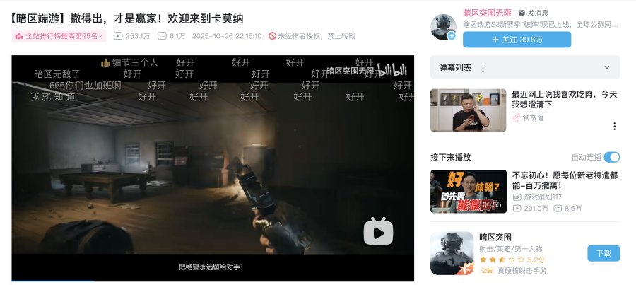 甚至是同为腾讯旗下的《暗区突围》《暗区突围:无限》也加入战场,前者视频标题为“永远撤离,永远突围”,后者则为“撤得出,才是赢家”,评论区里有大量玩家留言“回头是暗”,一时间成为射击游戏玩家之间流行的口号。