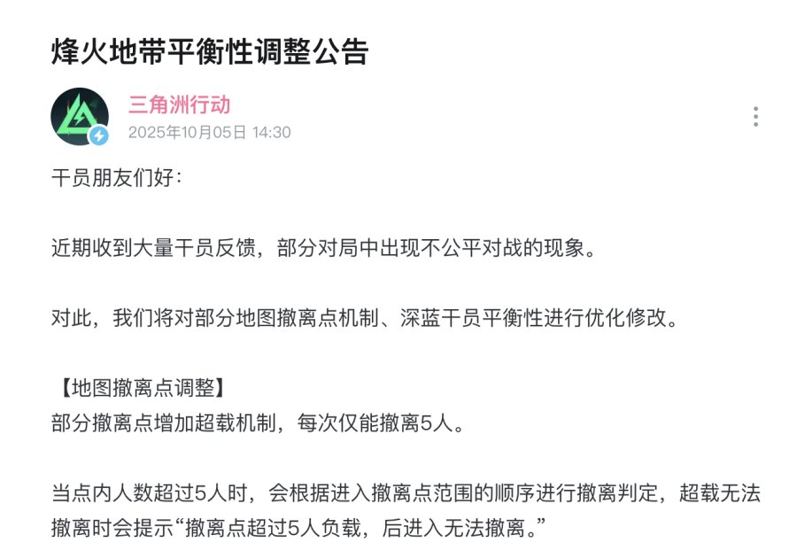 起因是一次突如其来的游戏调整。10月5日,《三角洲行动》公告称,近期收到大量玩家反馈,部分对局中出现不公平对战的现象。对此项目组修改了部分地图撤离点机制,每次仅能撤离5人;另对游戏角色“深蓝”属性进行优化修改。