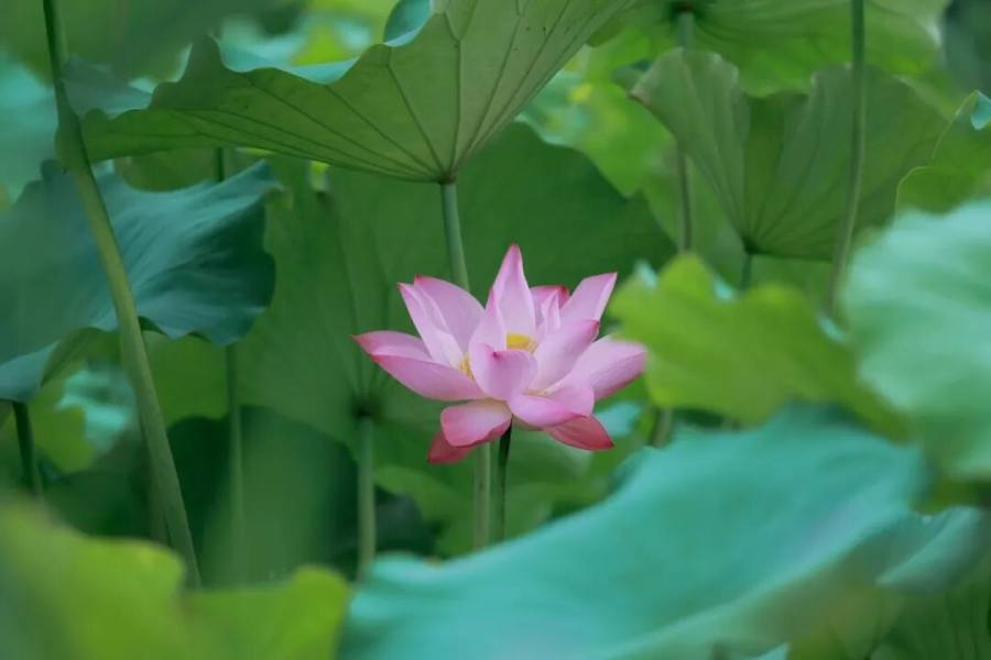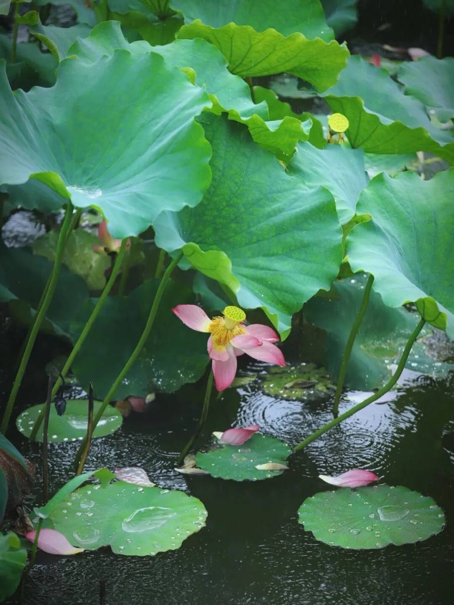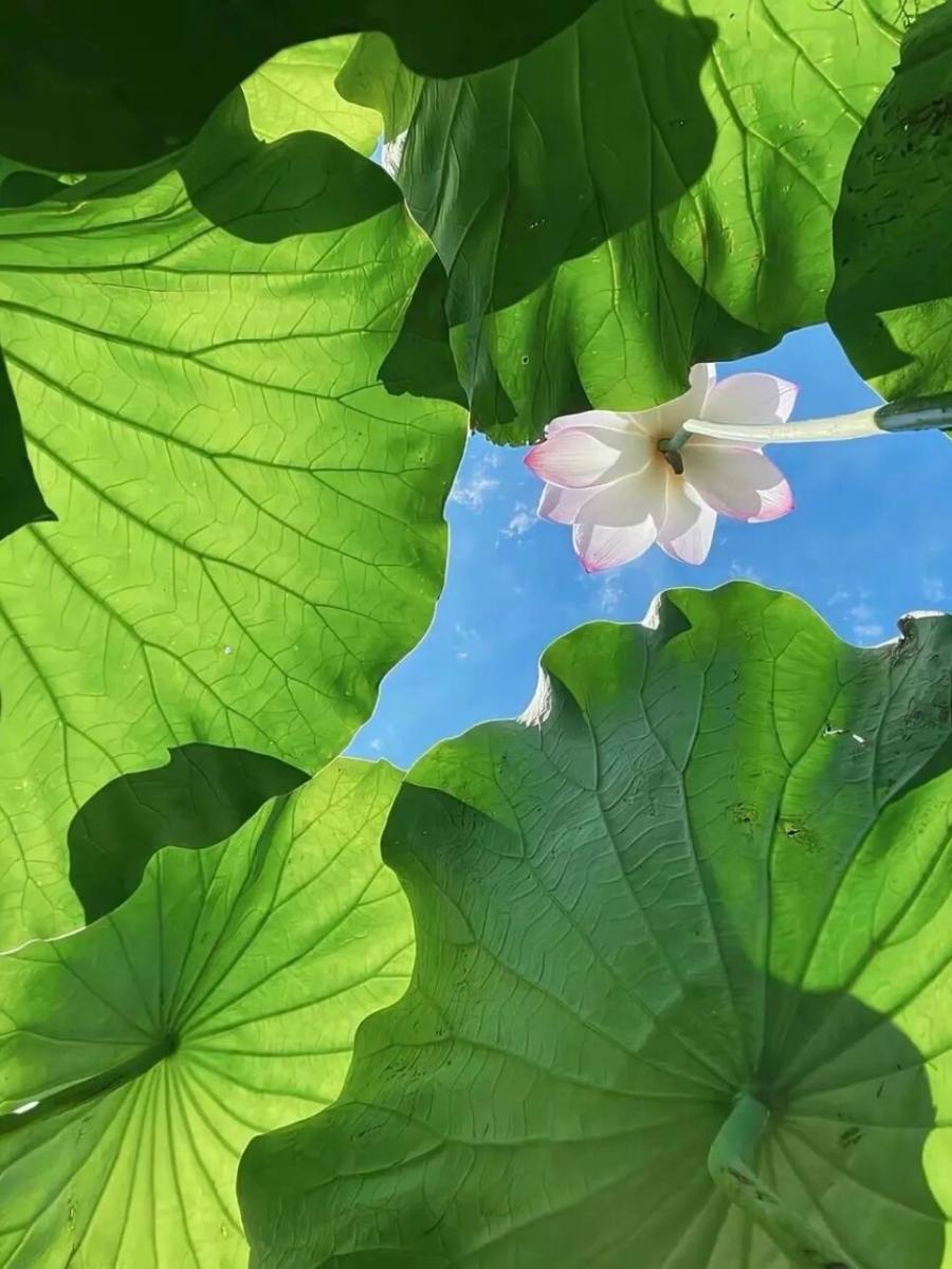 撑船划入的仿佛是另一个世界,高低不齐的荷叶蔓过我的头顶,低低的几朵又擦过我的手臂,四处充斥清新的荷香。远观还是一片明亮的池水,在近处细看,因为被荷叶遮挡了光线,变得幽深如有墨痕一般,衬的掩映绿丛中的几朵荷花格外娇嫩,花瓣细蕊饱满水润,像是饱吸了这池水一般,亭亭净植,宁静幽雅。