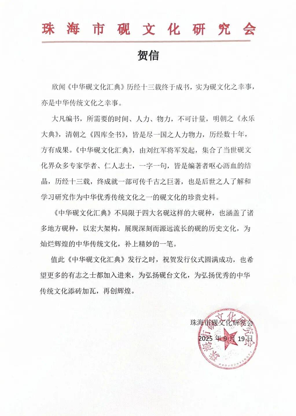 值此《中华砚文化汇典》发行之时,祝贺发行仪式圆满成功,也希望更多的有志之士都加入进来,为弘扬砚台文化,为弘扬优秀的中华传统文化添砖加瓦,再创辉煌。