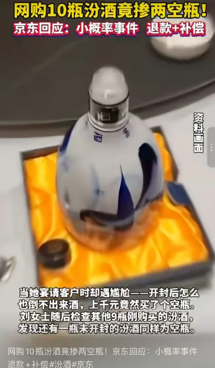 然而,就在这场消费狂欢的前夜,京东“空瓶门”却给行业敲响了警钟。据江苏经济报报道:今年9月,深圳刘女士在京东白酒专营区花费1.186万元购买的10瓶汾酒集团青花30白酒中,竟有两瓶是空瓶,宴请客户时的尴尬场景,至今仍让她耿耿于怀。