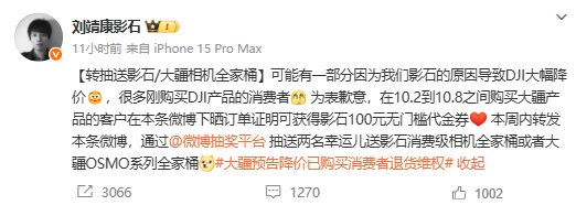 他发文称,可能有一部分因为我们影石的原因导致DJI大幅降价,为向很多刚购买DJI产品的消费者表达歉意,在10.2到10.8之间购买大疆产品的客户晒订单证明可获得影石100元无门槛代金券。