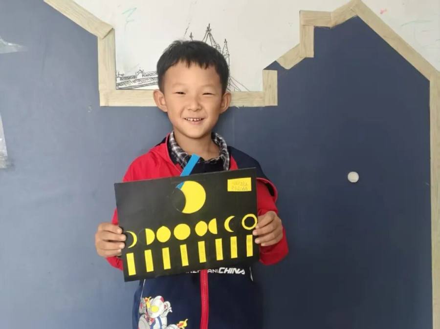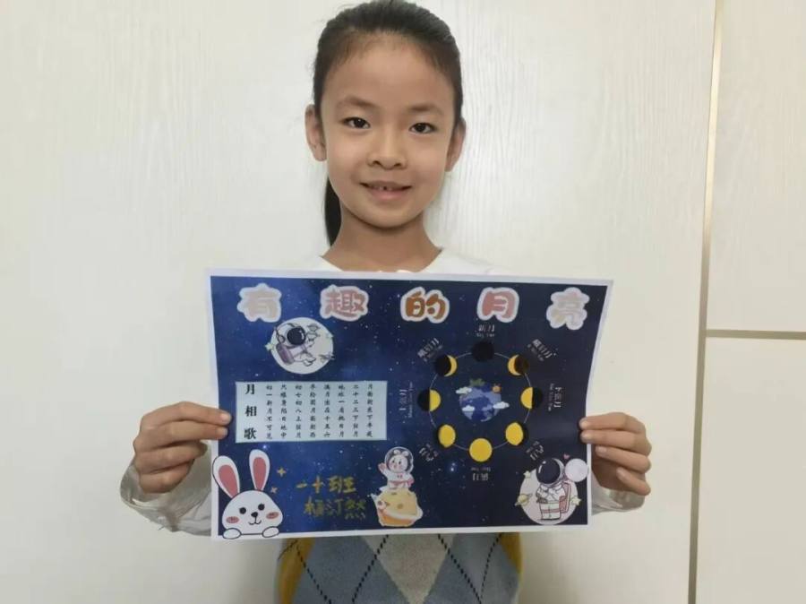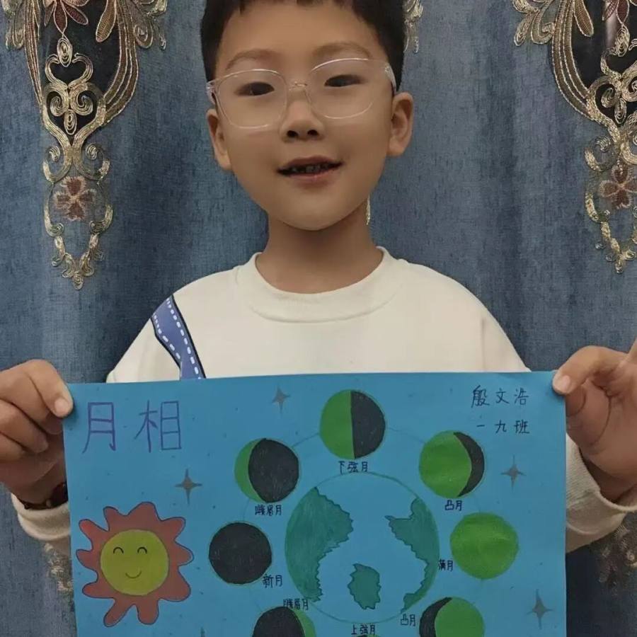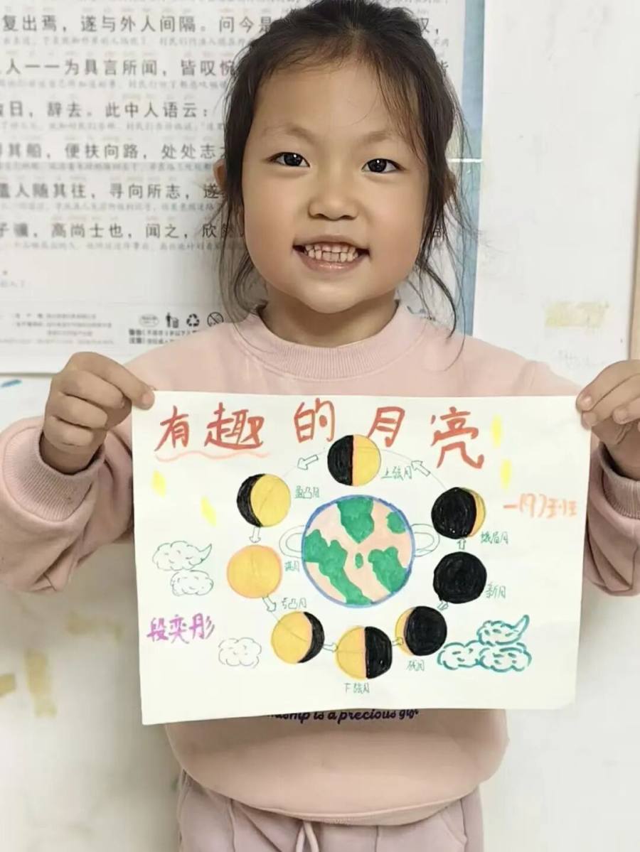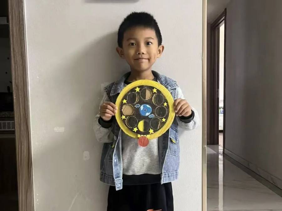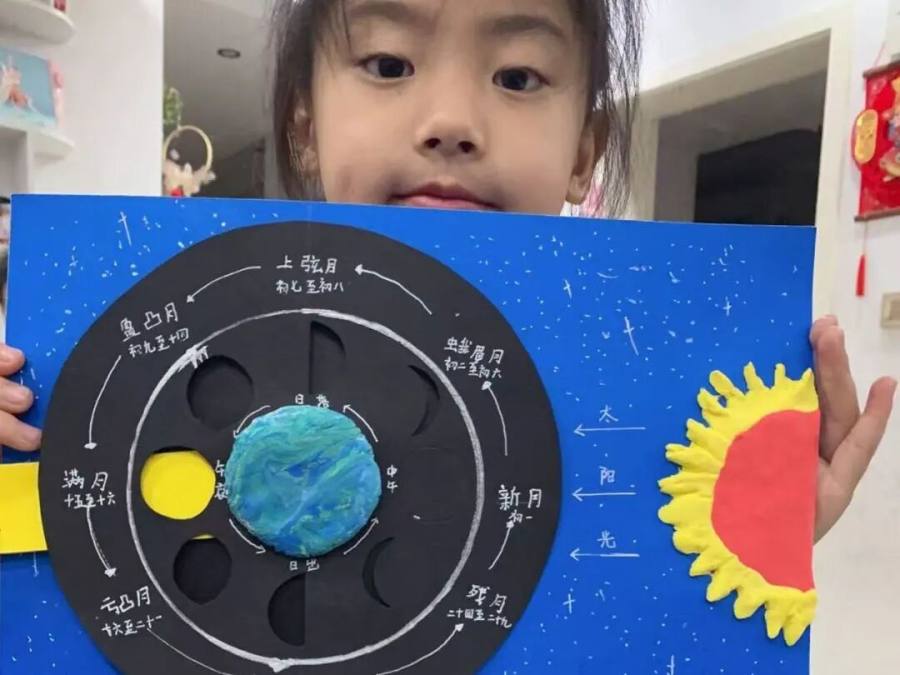 “月亮为什么有时候像小船,有时候像圆盘?”带着对月亮的好奇,孩子们动手制作月相盘。他们以圆形卡纸为底,将剪好的新月、上弦月、满月等月相一一上色,再按顺序精心粘贴,最后用彩笔添上星星、云朵装饰。一个个色彩鲜艳、排布准确的月相盘诞生,孩子们在动手实践中轻松掌握了月相变化的科学知识,感受着中秋与科学碰撞的乐趣。