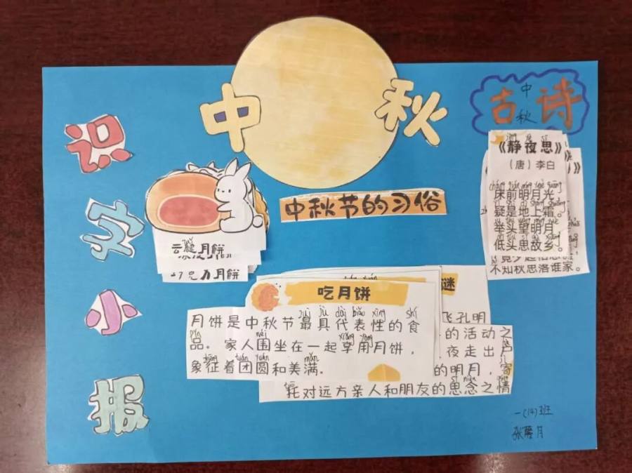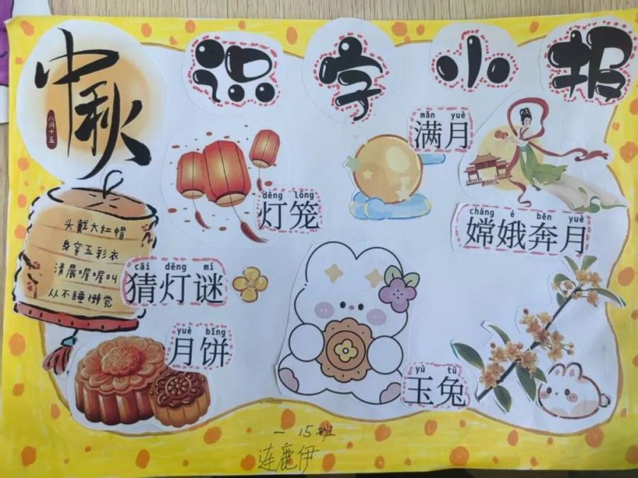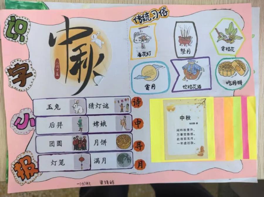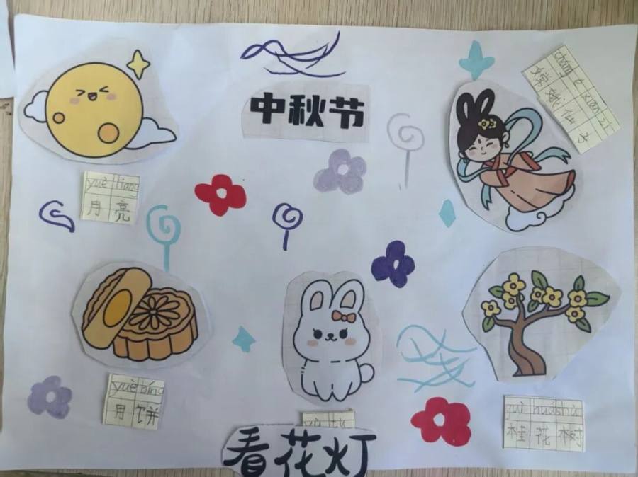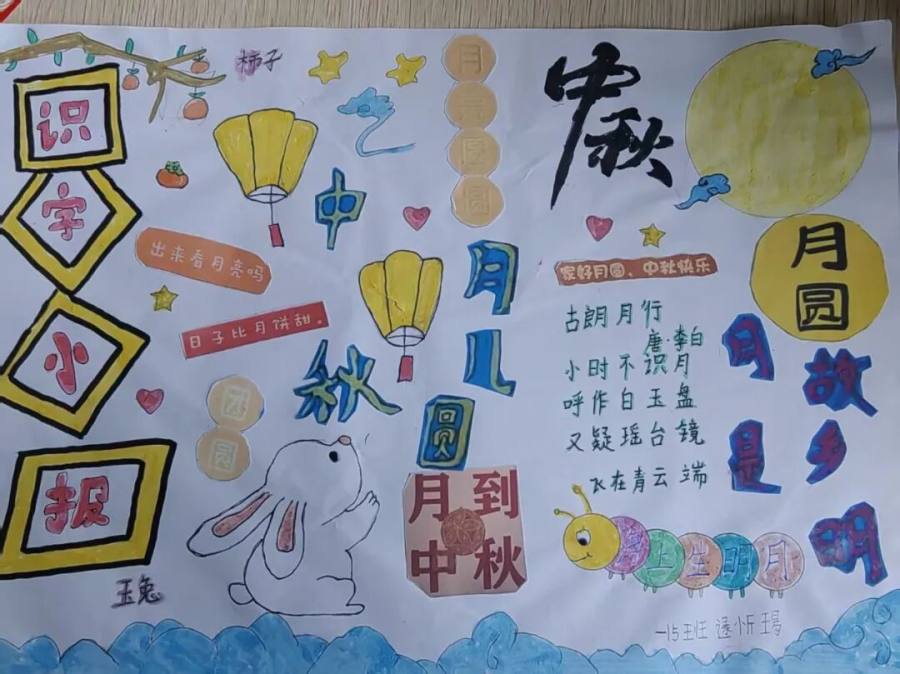 “我心中的中秋月,是挂在彩虹上的!”“我的中秋月里,有小兔子和桂花树!”在“勾勒中秋月”环节,孩子们拿起马克笔,在A4纸上尽情挥洒创意。色彩鲜明的画作里,藏着他们对中秋最纯真的想象;而在识字小报制作中,孩子们剪贴生活里与“中秋”相关的字词,既锻炼了动手能力,又加深了对节日的认知。