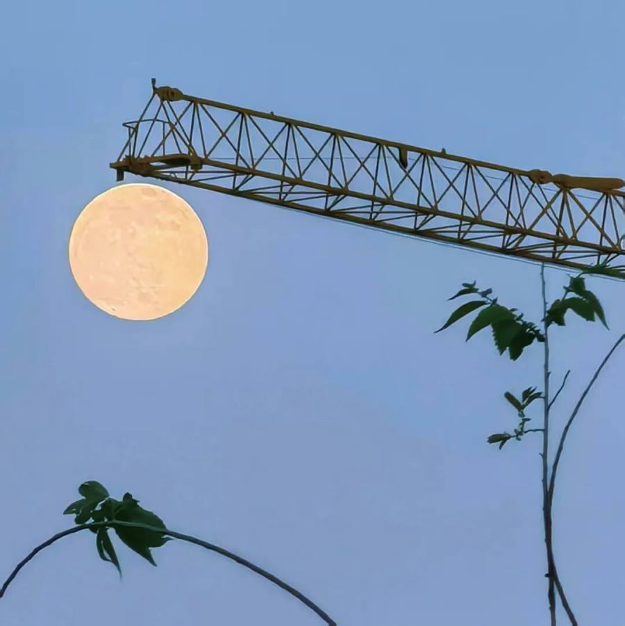 2022年4月,我在香山随手拍月亮,镜头里有台大吊车,站在那个角度一看,倒像是吊车“钓”着一轮圆月,正是“钓来东海一轮月,照我蹒跚夜路行”,这是拍得比较好的一张照片。