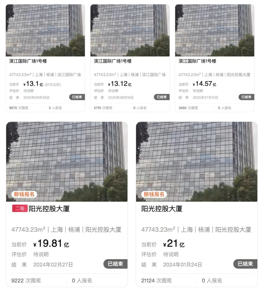 公开资料显示,滨江国际广场1号楼建成于2017年8月,并更名为“阳光控股大厦”。2022年起,阳光城为偿还债务,抵押滨江国际广场1号楼并多次拍卖,上架1年,4次流拍,最终在今年以13.1亿元售出。