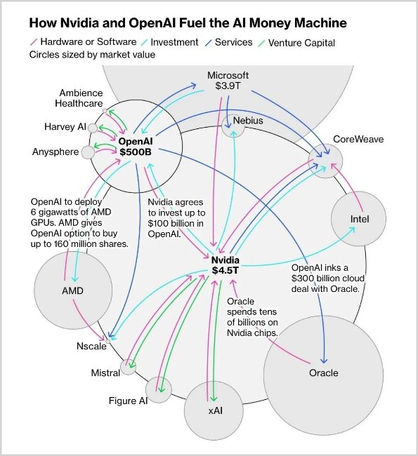 英伟达斥资千亿美元投资OpenAI布局AI系统,OpenAI转而将千亿美元投入甲骨文购买云计算服务,甲骨文又转身向英伟达采购千亿美元芯片。