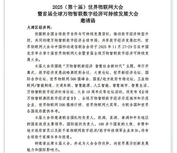 本网讯,根据联合国全球数字合作与可持续发展目标,推动数字经济转型升级,共同构建万物智联数字经济全球市场,共享数字经济发展红利,世界物联网大会与中国移动通信联合会将于2025年 11月 27-29日在中国北京举办第十届世界物联网大会暨首届全球万物智联数字经济可持续发展大会。