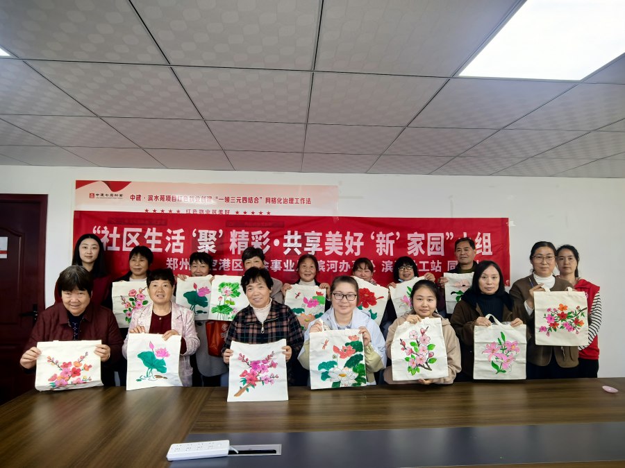居民们围坐在一起,专注地在帆布包上勾勒线条、填充色彩。有的居民对照模板认真描摹,淡雅的兰花、粉嫩的桃花在帆布包上渐渐舒展;有的居民则结合自身经验稍作创新,给荷花添上几片露珠,让画面更显灵动;还有的居民们互相交流着绘画心得,不时探讨配色技巧,欢声笑语不断。经过大家的精心创作,一个个原本素净的帆布包变成了色彩斑斓、充满个性的艺术品。居民们纷纷拿着自己的作品拍照留念,脸上洋溢着成就感和幸福感。“看我画的荷花多鲜艳,以后买菜逛街就能背,实用又好看。”家住3号楼的张阿姨举着自己的作品,笑得合不拢嘴。