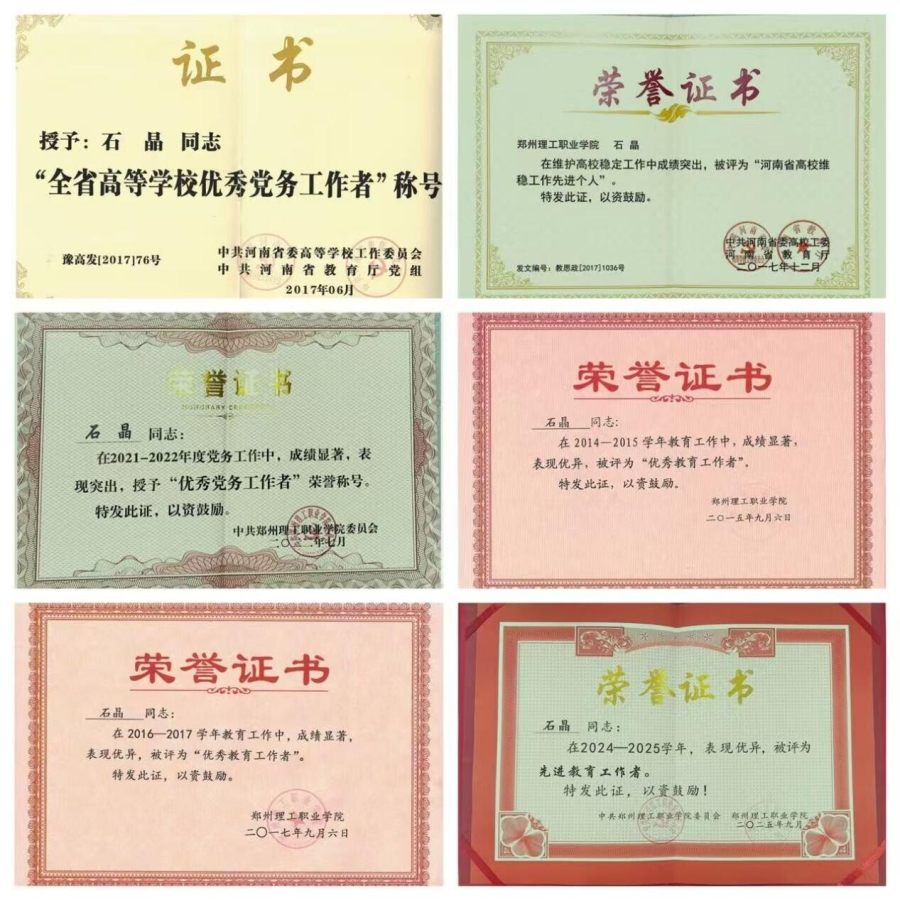 时间的年轮,刻录下奋斗的足迹。从2015年至今,石晶从校级“优秀教育工作者”“优秀共产党员”,成长为省级“优秀党务工作者”“维稳工作先进个人”,2022年、2024年先后获评校级“优秀党务工作者”,2024-2025学年再度获评校级“先进教育工作者”。这些荣誉不仅是对她过往工作的肯定,更是她始终保持先进本色、在平凡岗位上追求卓越的生动写照。