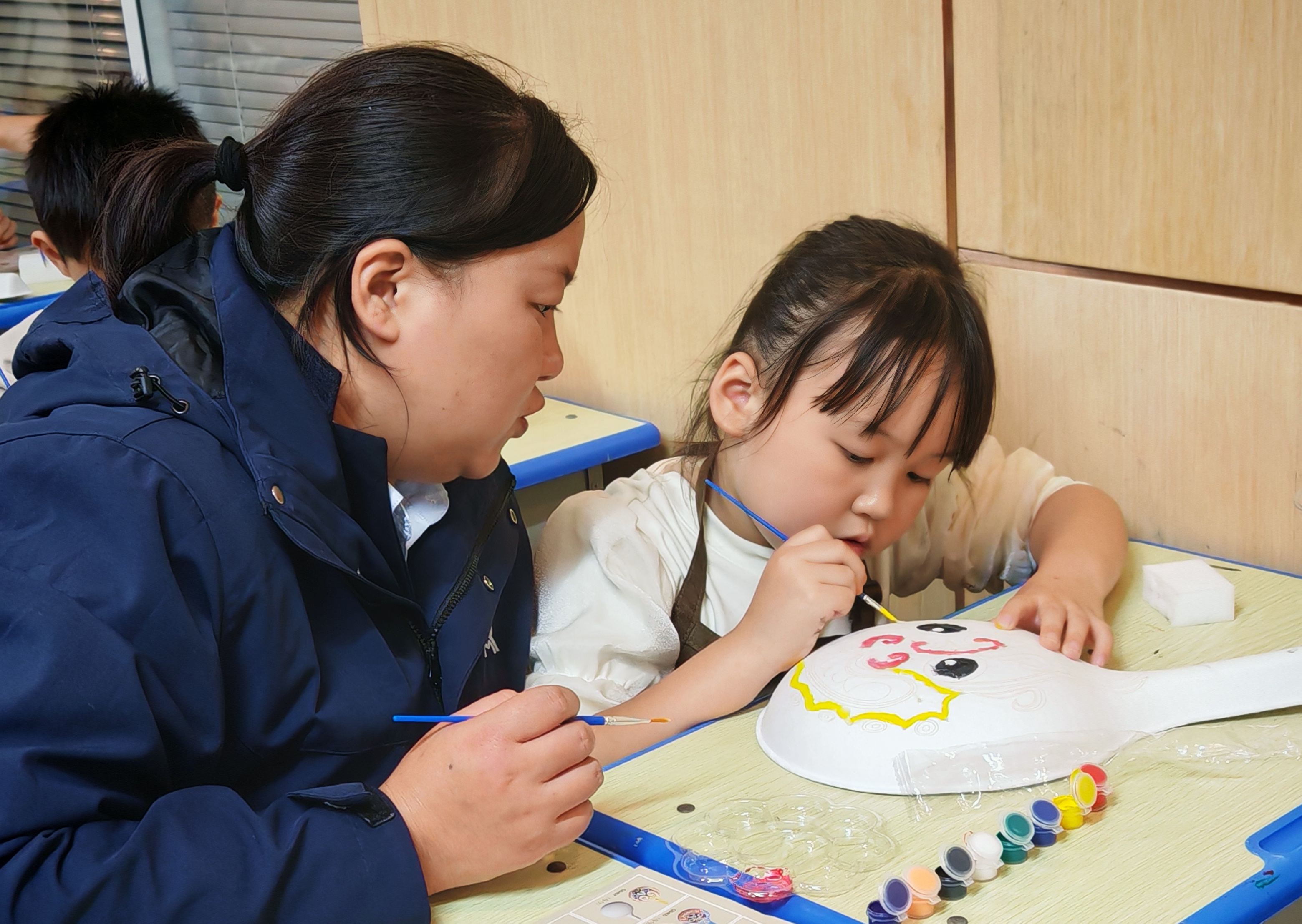 当老师把马勺胚和颜料分发下来时,孩子们的创作热情瞬间被点燃。他们在家长的协助下大胆构图、细致填色,充分发挥天马行空的想象力,将传统纹样与现代元素巧妙结合,创作出独一无二的马勺作品。狮子、龙纹、花卉等传统图案,在孩子们的笔下焕发出新的生机。