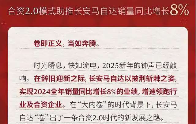 值得注意的是,马自达曾在2025年新年贺词中极尽溢美之词,称其在“大内卷”的时代背景下“卷”出了一条合资2.0时代的新发展之路,2024全年销量同比增长8%,增速领跑行业及合资企业。