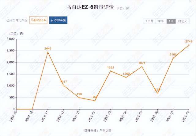 “车主之家”数据显示,马自达EZ-6上市次月达到了月销2445辆的高度,但此后销量便如同“过山车”般起伏不定,2025年1月、2月的单月销量均不到500辆,在月销恢复1000辆以上并保持三个月后,6月销量又降至678辆。
