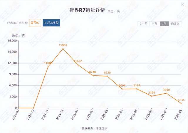 一个典型的例证便是,即便邀请了颇有国民度的“神仙姐姐”刘亦菲参与品牌宣传活动和新品发布会,智界也未能阻止旗下车型销量下滑的颓势,智界R7的月销量由2024年12月的1.59万辆断崖式下跌至2025年8月的1235辆。