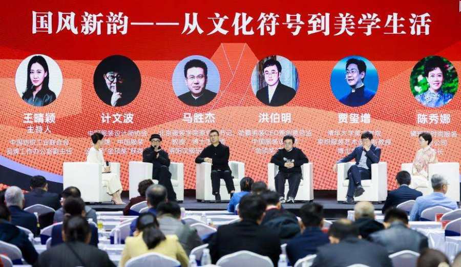 大会的嘉宾对话环节以“国风新韵 —— 从文化符号到美学生活”为主题,中国纺织工业联合会品牌工作办公室副主任王晴颖与中国服装设计师协会副主席、中国时装设计“金顶奖”设计师计文波,北京服装学院原党委书记、教授、博士生导师、洛阳汉服研究院院长马胜杰,劲霸男装CEO兼创意总监、中国时装设计“金顶奖”设计师洪伯明,清华大学美术学院染织服装艺术设计系教授、博士生导师贾玺增,黛玛诗时尚服装有限公司董事长陈秀娜五位嘉宾围坐论道,为国风时尚发展点亮新思路。