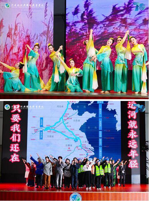 开幕式后,由大学生艺术团和来自各二级学院的学生带来的“光辉七十载 共筑水利梦”汇报演出正式开始。演出现场气氛热烈,节目内容精彩纷呈。舞台剧《时光的印记》以细腻的叙事手法,生动再现了从1955年白马寺初创到新时代跨越发展的峥嵘岁月,将几代水环人艰苦奋斗的场景一幕幕重现在观众眼前,令人动容。随后的歌曲串烧《岁月如歌》则通过不同时代的经典旋律,串联起七十年的光阴故事,引发了全场不同年龄段校友的深切共鸣。极具专业特色的情景剧《运河风华》,将古代水利智慧与当代治水精神巧妙融合,展现了水利人一脉相承的使命担当。大型舞蹈《万象更新 云程发轫》,则以恢宏的场面和充满力量的舞姿,寓意着学校在新起点上蓄势待发、前程万里的壮阔图景,将现场气氛推向高潮。