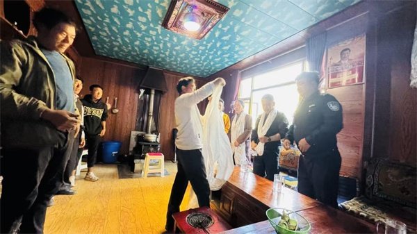 今年10 月 10 日,工作室团队开展矛盾纠纷回访工作,在回访一起 “五年欠款纠纷” 时,当事人阿某紧紧握着呷绒降泽的手,眼眶泛红。时间回到纠纷化解前,20 万元欠款拖欠五年,阿某多次讨要无果,双方关系濒临破裂。为维护公平正义、防止矛盾升级,呷绒降泽带领工作室成员联合派出所民警、镇政府工作人员,一次次往返于欠款人与阿某家中调查核实,一场场组织双方座谈协商,最终以法理为依据、以情理为纽带,促成欠款人按约还款。“他们跑断了腿、磨破了嘴,就是为了帮我要回辛苦钱,这份恩情我忘不了!” 阿某说着,将一条洁白的哈达郑重地献给呷绒降泽与随行民警。同日,在另一起矛盾纠纷的回访现场,村民与村干部们也对 “呷呷调解工作室” 赞不绝口。今年 7 月 20 日,一村务议事会现场,一名村民因无理要求被拒,与村干部发生口角甚至抓扯,现场秩序一度混乱。接到求助后,呷绒降泽与派出所民警迅速到场,不仅高效控制现场局势,更对涉事村民展开 “法理 + 心理” 双重帮教 —— 既讲政策法规,也谈邻里情长,最终让涉事村民认识到错误,主动向村干部道歉。“当时要是没人及时疏导,说不定就闹大了!呷呷他们不仅解决了问题,还保住了我们村的和气!” 回访现场,一条条洁白的哈达,瞬间绘就成“警心有民、民心有警” 的和谐画卷。