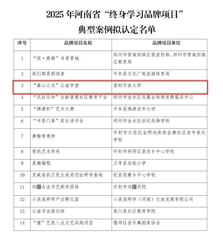 根据《河南省教育厅办公室关于报送河南省新时代“百姓学习之星”和“终身学习品牌项目”典型案例的通知》(教办职成〔2025〕226号)要求,经单位申报、资料初审、会议评审三重严格流程,拟认定120个河南省新时代“百姓学习之星”典型案例与87个“终身学习品牌项目”典型案例,目前已正式进入公示阶段。其中,登封开放大学“嵩山之光”公益学堂,成功入选省级“终身学习品牌项目”典型案例。