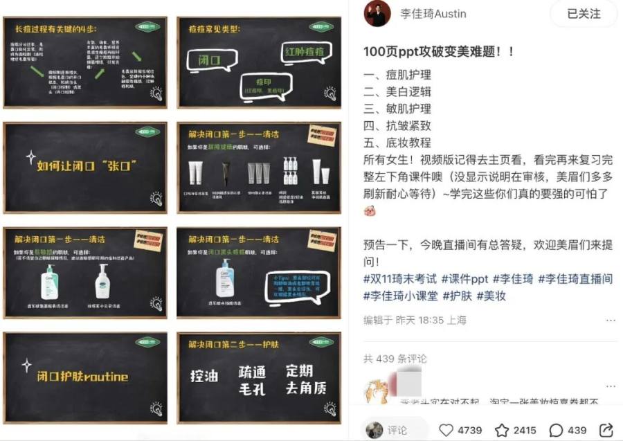他将今年双十一小课堂爆改双十一大考,取名为“双十一琦末考试”,采用了“琦”的谐音梗,以美白逻辑、敏肌护理、痘肌护理、抗皱紧致、底妆教程等五大消费者关注度较高的话题为课程“现身教学”。