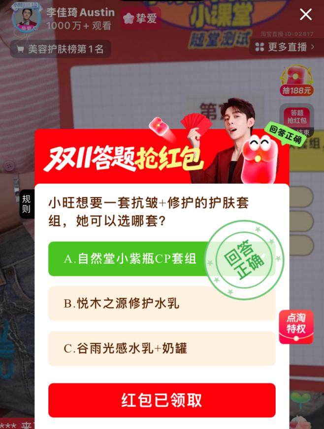 为了进一步提升购物体验感和惊喜感,今年双十一李佳琦直播间在平台通用机制外,加码了福利玩法。不仅在10月15日、16日两天集中发放“红包雨”,还首次创新推出“集卡片赢红包”、“答题抢红包”等互动玩法。其中,颇具趣味性的是“答题抢红包”玩法。为了“验收”学习成果,李佳琦直播间增添了小课堂随堂测试环节,在直播间内答对问题的用户还有机会获得红包“奖学金”。