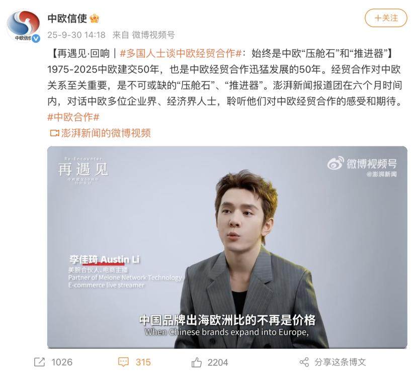 国货美妆护肤品的崛起出海进程中,李佳琦画下了浓墨重彩的一笔。9月末,外交部欧洲司官方账号发布的《再预见·回响》视频中,对话了中欧多位企业界、经济界人士,其中李佳琦以美腕合伙人、电商主播的身份分享了他对中国品牌出海欧洲的建议。