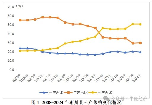淅川县一产占比较高,2019年第三产业占比超过第二产业,三次产业结构转变为“三二一”。2024年三产结构表现为20.0:29.4:50.6。