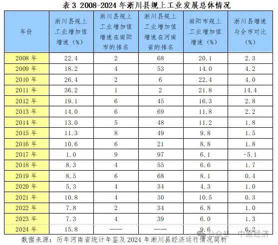 从规上工业增加值增速来看,在2008-2024年间,除2017年外,淅川县规上工业增加值增速均高于南阳市水平,2024年增速为15.8%,高于南阳市6.2个百分点。2023年增速为7.3%,在南阳市下辖11个县(市)中排名第4位,在河南省下辖102个县(市)中排名第39位。