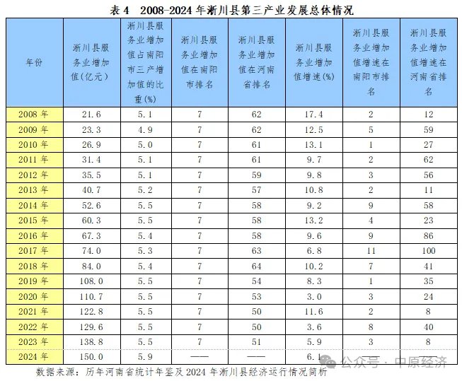 淅川县服务业增加值逐年增长,2024年为150.0亿元。2023年为138.8亿元,在南阳市下辖11个县(市)中排名第7位,在河南省下辖102个县(市)中排名第51位。从服务业增加值增速来看,2024年淅川县服务业增加值增速为6.1%。2023年淅川县服务业增加值增速为5.9%,在南阳市下辖11个县(市)中排名第3位,在河南省下辖102县(市)中排名第8位。