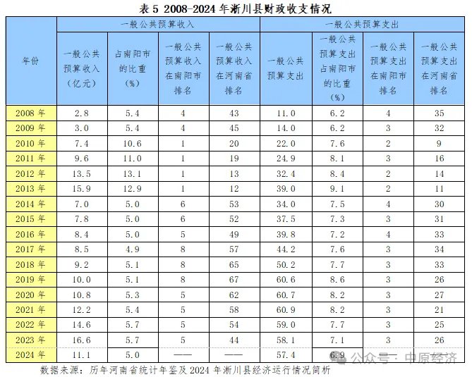 从财政收支总体情况来看,2024年淅川县一般公共预算收入达11.1亿元,一般公共预算支出达57.4亿元。2023年淅川县一般公共预算收入达16.6亿元,占南阳市一般公共预算收入的5.7%,在南阳市下辖11个县(市)中排名第5位,在河南省下辖102县(市)排名第44位;一般公共预算支出达到58.1亿元,占南阳市一般公共预算支出的7.1%,在南阳市下辖11个县(市)中排名第3位,在河南省下辖102个县(市)排名第26位。