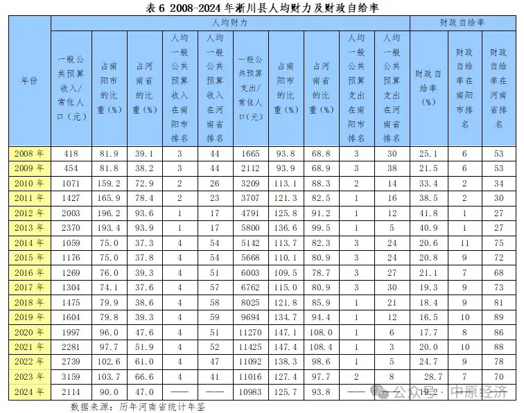 从人均财力看,2024年淅川县人均一般预算公共收入为2114元,相当于南阳市人均一般公共预算收入的90.0%,相当于河南省人均一般预算公共收入的47.0%;人均一般公共预算支出达到10983元,相当于南阳市人均一般公共预算支出的125.7%,相当于河南省人均一般公共预算支出的93.8%。从财政自给率看,淅川县财政自给率低于南阳市和河南省财政自给率。2024年淅川县财政自给率为19.2%。2023年淅川县财政自给率为28.7%,在南阳市下辖11个县(市)中排名第7位,在河南省下辖102个县(市)中排第70位。