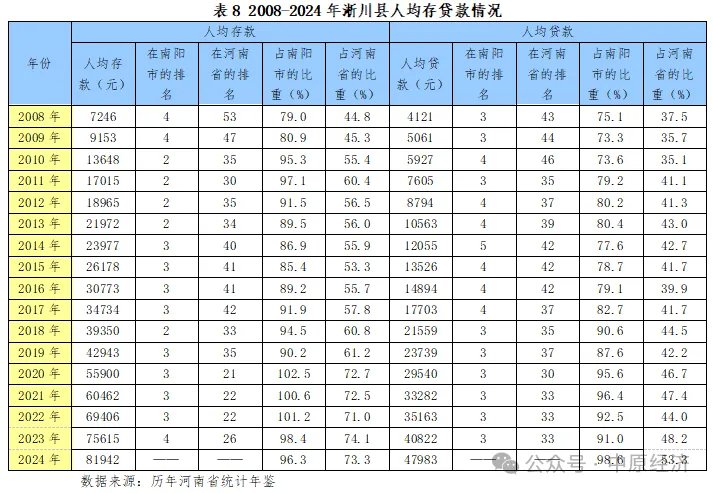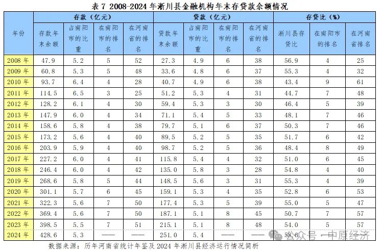 从存贷比看,2024年淅川县存贷比为58.6%。2023年存贷比为54.0%,在南阳市下辖11个县(市)中排名第5位,在河南省下辖102个县(市)排名第57位。