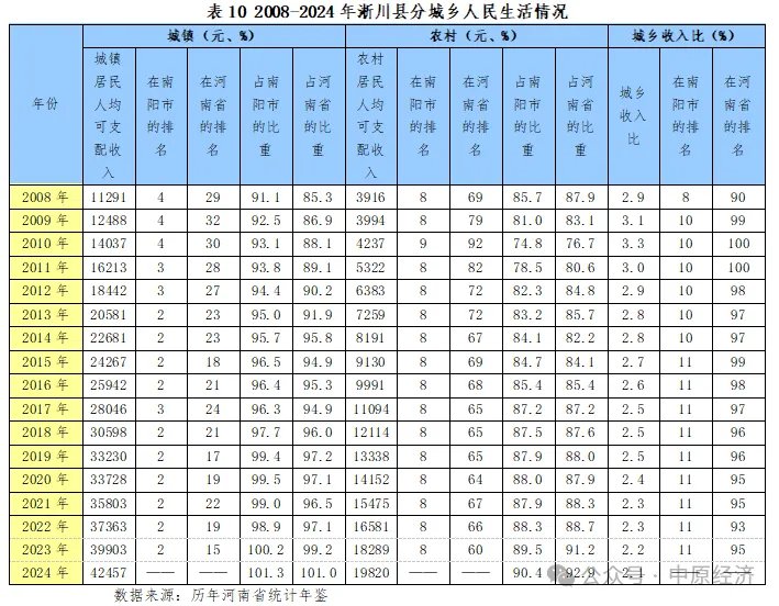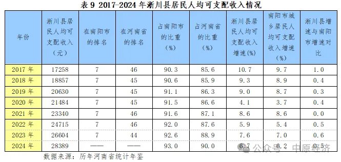 从居民收入增速看,淅川县居民人均可支配收入增速均高于南阳市,2024年增速为6.7%,高于南阳市居民人均可支配收入增速0.5个百分点。