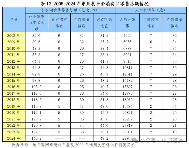 从社会消费情况来看,淅川县社消零总额在省市的排名均处于中游,人均社消零在全省的位次稍有下降。2024年淅川县社消零总额为146.2亿元,人均社消零为27958元;2023年淅川县社消零总额为137.0亿元,在南阳市下辖11个县(市)中排名第5位,在河南省下辖102个县(市)中排名第33位;人均社消零为26001元,在南阳市下辖11个县(市)中排名第2位,在河南省下辖102个县(市)中排名第18位。