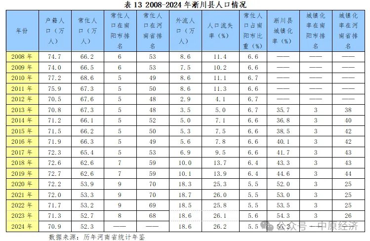 从人口情况看,淅川县城镇化率水平在全省县域中排名处在中上游,人口流失率超过20%。2024年淅川县常住人口为52.3万人,占南阳市常住人口的5.5%。2023年淅川县常住人口为52.7万人,占南阳市常住人口的5.6%,在南阳市下辖11个县(市)中排名第8位,在河南省下辖102个县(市)中排名第68位;人口外流18.6万,人口流失率为26.1%;城镇化率为54.3%,在南阳市下辖11个县(市)中排名第3位,在河南省下辖102个县(市)中排名第26位。